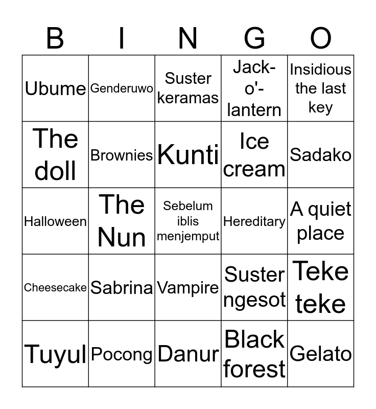 This bingo card has a free space and 24 words: Sabrina, Pocong, Kunti, Tuyul, Insidious the last key, Ubume, The doll, Genderuwo, Hereditary, Vampire, Ice cream, Halloween, Suster ngesot, Teke teke, Brownies, Black forest, A quiet place, Suster keramas, Sadako, The Nun, Gelato, Cheesecake, Jack-o'-lantern and Danur.