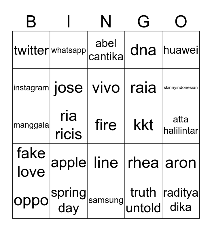 This bingo card has 25 words: apple, samsung, vivo, oppo, huawei, twitter, instagram, whatsapp, kkt, line, raia, manggala, rhea, aron, jose, raditya dika, atta halilintar, abel cantika, skinnyindonesian, ria ricis, fire, spring day, fake love, dna and truth untold.