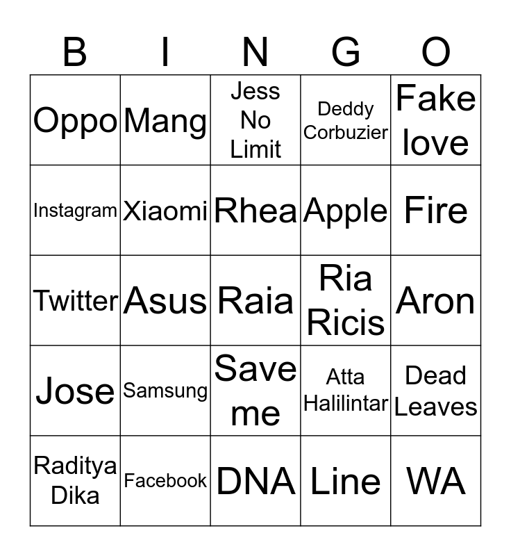 This bingo card has a free space and 24 words: Samsung, Facebook, Rhea, Raditya Dika, Fake love, Oppo, Instagram, Mang, Ria Ricis, Save me, Apple, Twitter, Atta Halilintar, Dead Leaves, Xiaomi, Line, Aron, Jess No Limit, Fire, Asus, WA, Jose, Deddy Corbuzier and DNA.