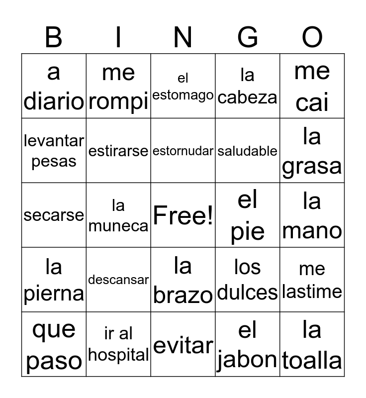 This bingo card has a free space and 24 words: descansar, ir al hospital, estornudar, que paso, me cai, a diario, levantar pesas, me rompi, el pie, la brazo, saludable, secarse, los dulces, me lastime, estirarse, el jabon, la mano, el estomago, la grasa, la muneca, la toalla, la pierna, la cabeza and evitar.