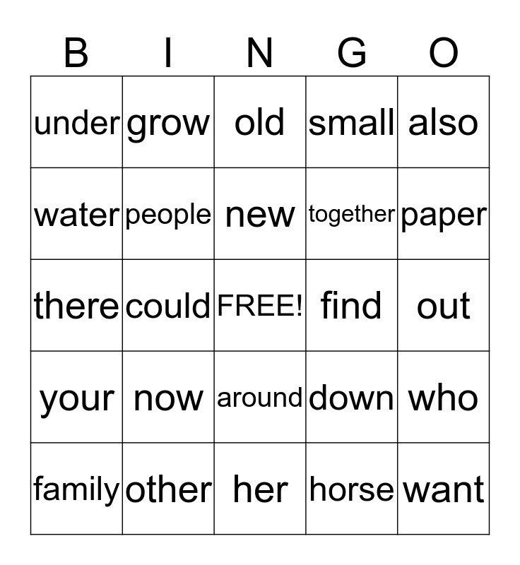 This bingo card has a free space and 24 words: now, other, new, family, also, under, water, grow, find, around, together, there, down, who, people, horse, out, old, paper, could, want, your, small and her.
