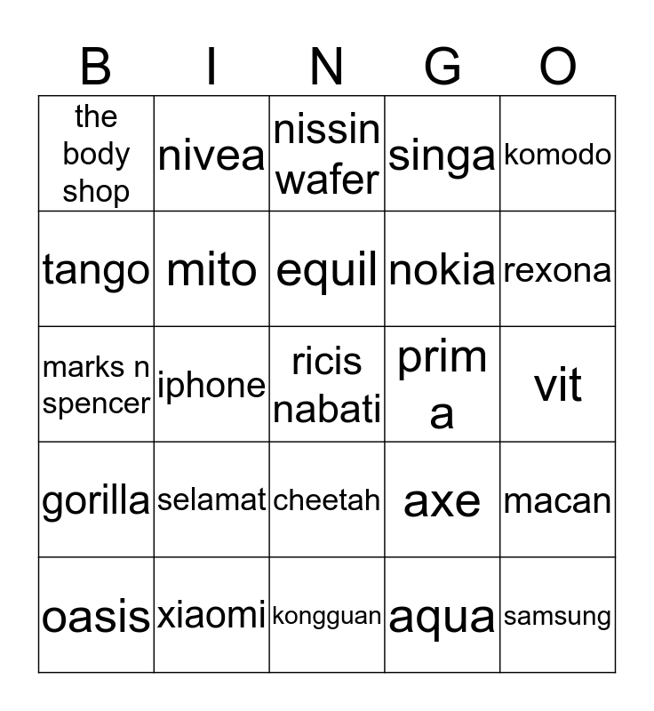 This bingo card has a free space and 24 words: selamat, xiaomi, equil, oasis, komodo, the body shop, tango, nivea, prim a, cheetah, nokia, marks n spencer, axe, macan, mito, aqua, vit, nissin wafer, rexona, iphone, samsung, gorilla, singa and kongguan.