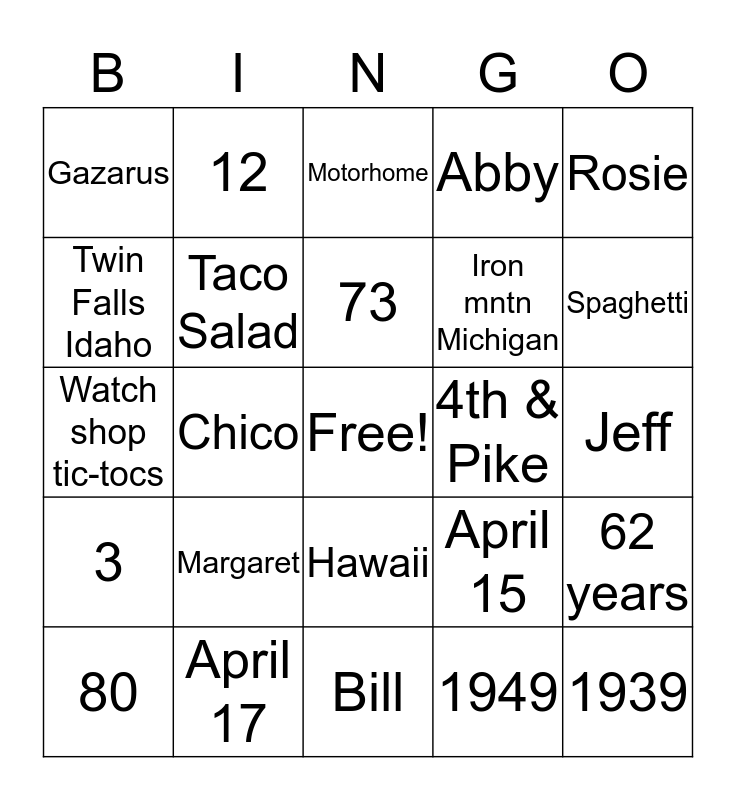 This bingo card has a free space and 30 words: April 17, Max, Chico, Turdeni, Gazarus, Motorhome, Taco Salad, Hawaii, 4th & Pike, Bill, Jeff, 1939, 1949, Blind Date white shutters, Spaghetti, April 17, April 15, 3, Margaret, Rosie, Watch shop tic-tocs, Bremerton, 12, Iron mntn Michigan, Twin Falls Idaho, Abby, 62 years, 80, 73 and Bowling.