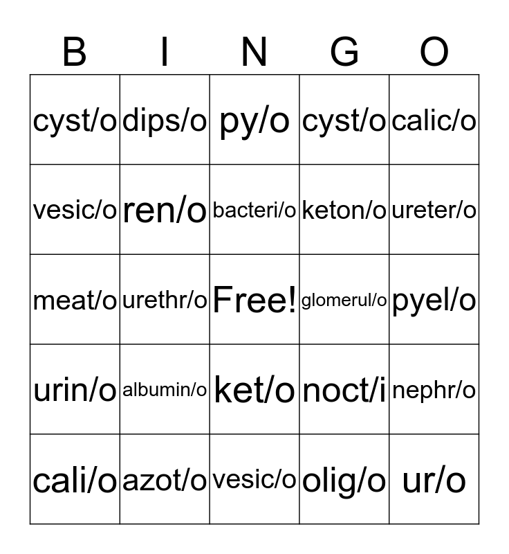 This bingo card has a free space and 24 words: albumin/o, azot/o, bacteri/o, cali/o, calic/o, cyst/o, vesic/o, dips/o, glomerul/o, ket/o, keton/o, meat/o, noct/i, nephr/o, ren/o, olig/o, pyel/o, py/o, ureter/o, urethr/o, ur/o, urin/o, cyst/o and vesic/o.