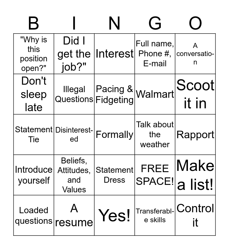 This bingo card has 25 words: Beliefs, Attitudes, and Values, Yes!, Pacing & Fidgeting, Loaded questions, A conversatio-n, "Why is this position open?", Don't sleep late, Did I get the job?", Talk about the weather, Statement Dress, Walmart, Statement Tie, FREE SPACE!, Make a list!, Illegal Questions, Control it, Rapport, Interest, Scoot it in, Disinterest-ed, Formally, A resume, Introduce yourself, Full name, Phone #, E-mail and Transferabl-e skills.