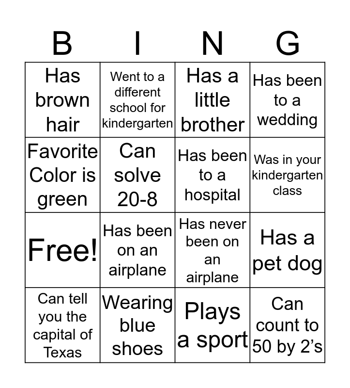 This bingo card has 20 words: Has a pet dog, Has a little sister, Has a little brother, Can solve 10+5, Can tell you the capital of Texas, Favorite Color is green, Wearing blue shoes, Has brown hair, Free!, Went to a different school for kindergarten, Has been on an airplane, Has never been on an airplane, Can solve 20-8, Can count to 50 by 2’s, Has been to a hospital, Has a pet cat, Was in your kindergarten class, Has been to a wedding, Plays a sport and Can tie their shoes.