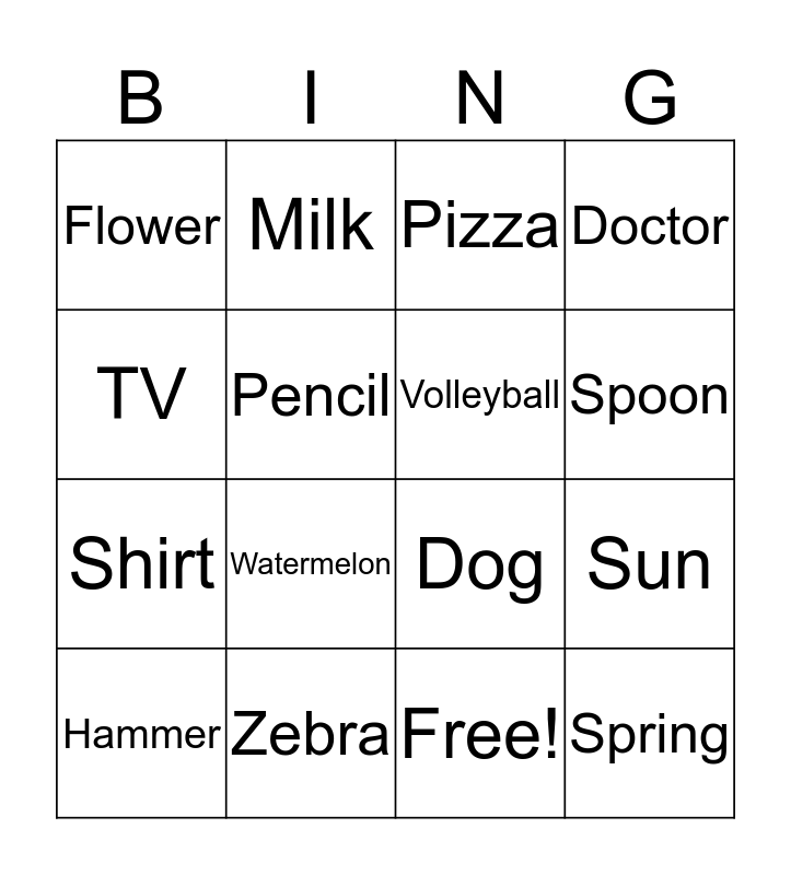 This bingo card has 17 words: Free!, Hammer, Pizza, Flower, Watermelon, Doctor, Sun, Volleyball, Spoon, Pencil, Zebra, Dog, TV, Milk, Shirt, Easter and Spring.