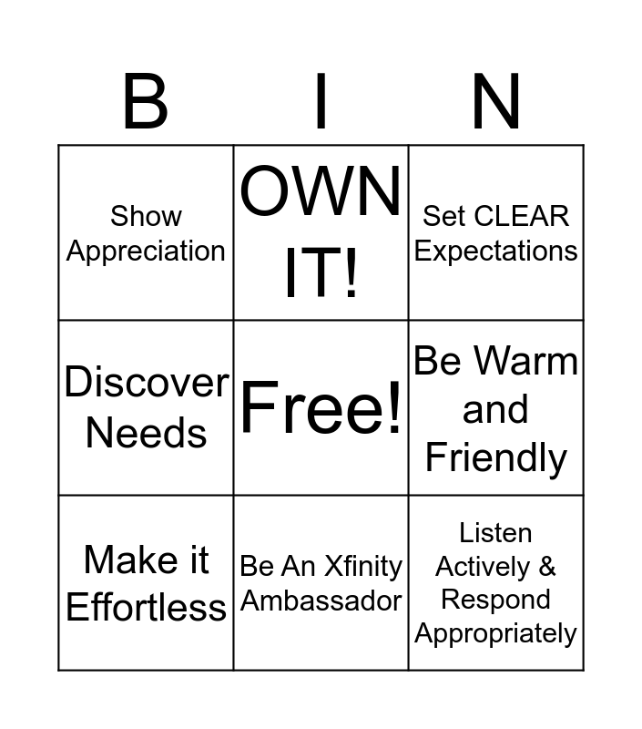 This bingo card has a free space and 8 words: Be Warm and Friendly, Set CLEAR Expectations, OWN IT!, Make it Effortless, Show Appreciation, Listen Actively & Respond Appropriately, Discover Needs and Be An Xfinity Ambassador.