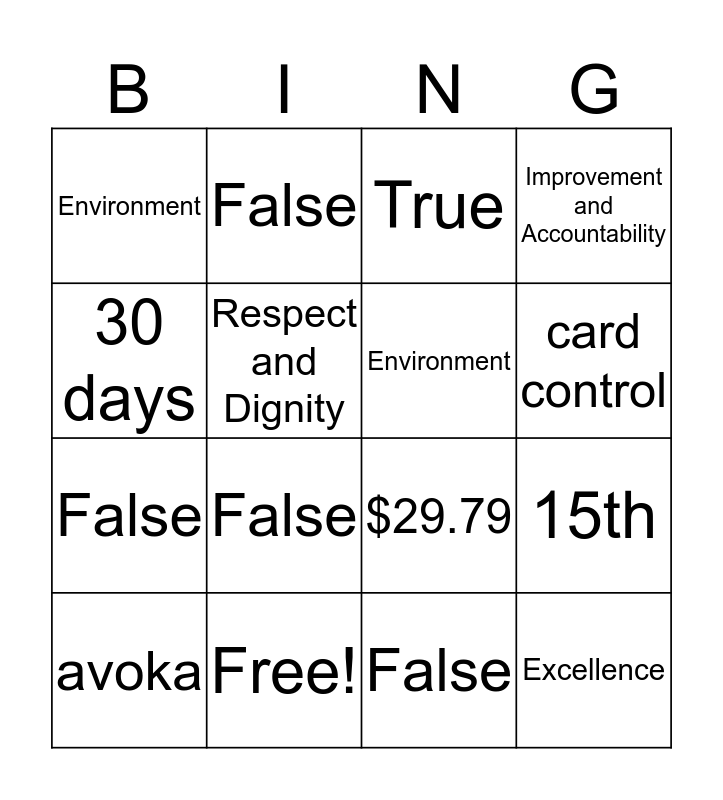 This bingo card has 24 words: 5%, iPay, card control, 25th, 30 days, Environment, Respect and Dignity, False, Free!, $32, False, $29.79, Free!, False, Environment, DMH, False, True, False, 15th, avoka, Excellence, Improvement and Accountability and False.