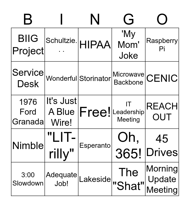 This bingo card has 3 images, a free space and 35 words: Wonderful, 45 Drives, "LIT-rilly", Storinator, DeuceDrop, Raspberry Pi, Microwave Backbone, It's Just A Blue Wire!, 'My Mom' Joke, Morning Update Meeting, REACH OUT, Service Desk, Nimble, Encryption at Rest, HIPAA, FERPA, IT Leadership Meeting, BIIG Project, Adequate Job!, CENIC, 3:00 Slowdown, After Hours Support, Lakeside, Spectrum Outage, AT&T Walkthrough, VOIP, Split Pair, Docker, Esperanto, The "Shat", Schultzie. . ., Microsoft, Oh, 365!, 1976 Ford Granada and 1963 Chrysler Imperial.