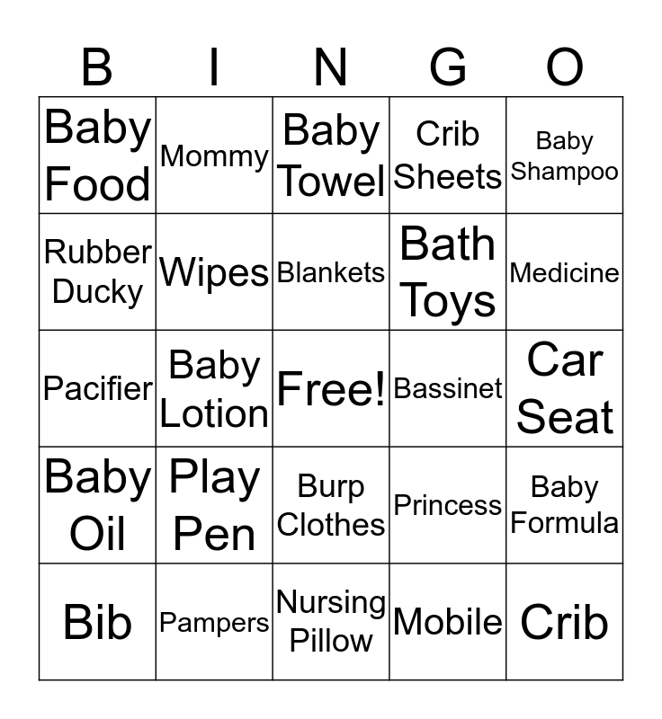 This bingo card has a free space and 40 words: Stroller, Pacifier, Bottle, Wipes, Pampers, Burp Clothes, Blankets, Socks, Baby Shampoo, Baby Oil, Baby Lotion, Crib Sheets, Crib, Car Seat, Bassinet, Play Pen, Booties, Baby Food, Baby Cereal, Baby Towel, Baby Formula, Mobile, Bath Toys, Rubber Ducky, Bouncer, Girl, Lo, Diapers, Teddy Bears, Diaper Bag, Baby Book, Bib, Baby Monitor, Princess, Medicine, Nursing Pillow, Onesies, Baby Bathtub, Mommy and Daddy.