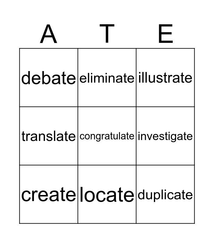 This bingo card has a free space and 13 words: donate, appropriate, duplicate, debate, illustrate, create, locate, celebrate, climate, eliminate, investigate, translate and educate.