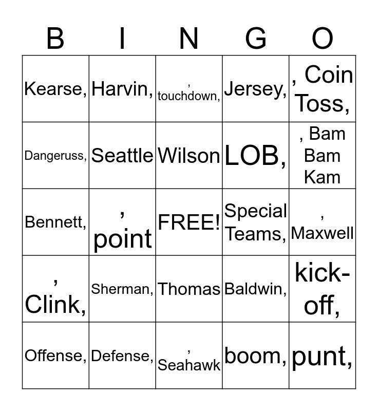 This bingo card has a free space and 42 words: Football,, Wilson, , Lynch,, Sherman,, boom,, kick-off,, punt,, Score!, , touchdown,, Thomas, , Maxwell, , Bam Bam Kam, , point, , Coin Toss,, quarterback,, Baldwin,, Tate,, Bennett,, Red,, Harvin,, Dangeruss,, Skittles,, Beastmode,, Kearse,, Percy,, Marshawn,, LOB,, Hauschka,, First down,, fieldgoal,, referee, , Clink,, Seattle, , Seahawk, , Super Bowl,, Offense,, Defense,, Special Teams,, Time Clock,, Champions,, Jersey, and Thurmond, Coach, Carroll, Paul Allen, Tightend, Run, Throw, Pass, Tackle, Interception, Ryan, Miller, Okung, Wagner, Robinson, Forced Fumble, blue, 12th man, Avril, Colman, Irvin, Lane, Mebane, Turbin, Quake, SeaGals, Taima, False Start, Louder,.