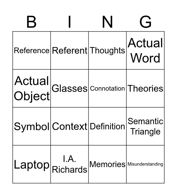 This bingo card has 16 words: I.A. Richards, Semantic Triangle, Thoughts, Reference, Symbol, Referent, Definition, Memories, Actual Object, Glasses, Laptop, Actual Word, Context, Theories, Connotation and Misunderstanding.