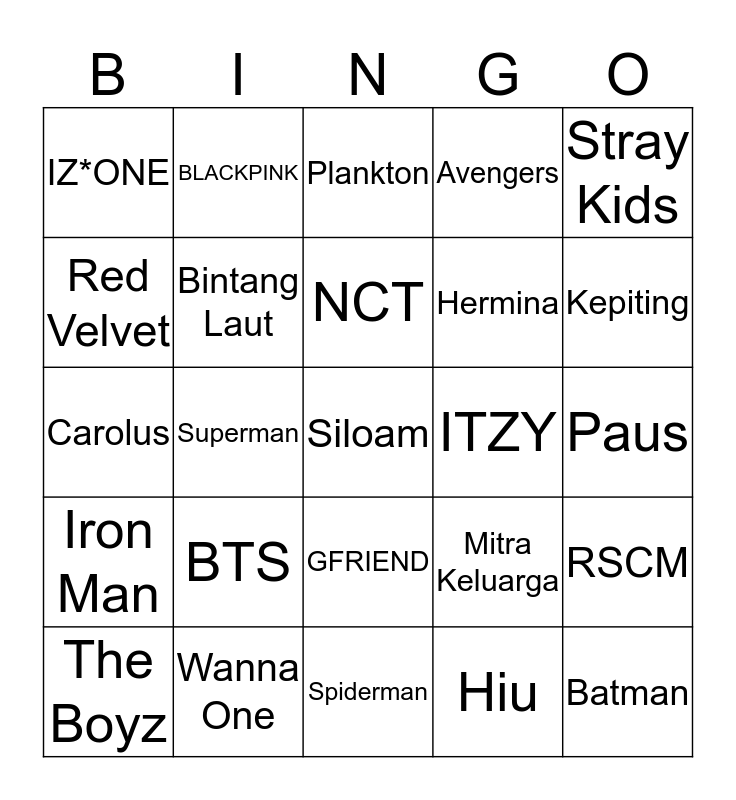 This bingo card has a free space and 24 words: BTS, Wanna One, NCT, The Boyz, Stray Kids, IZ*ONE, Red Velvet, BLACKPINK, ITZY, GFRIEND, Hermina, Carolus, Mitra Keluarga, RSCM, Bintang Laut, Hiu, Paus, Plankton, Kepiting, Superman, Batman, Iron Man, Avengers and Spiderman.