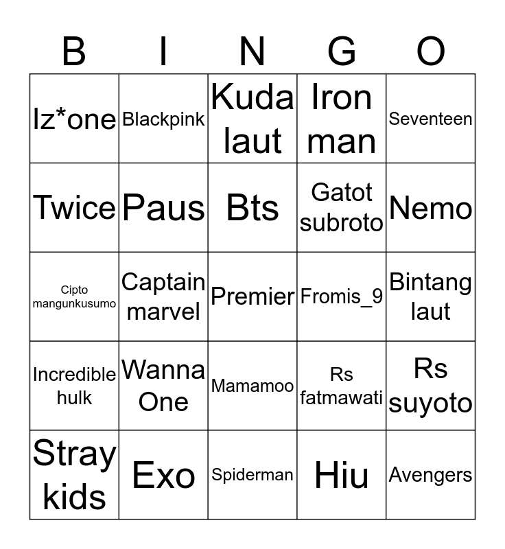 This bingo card has a free space and 24 words: Wanna One, Exo, Bts, Stray kids, Seventeen, Iz*one, Twice, Blackpink, Fromis_9, Mamamoo, Gatot subroto, Cipto mangunkusumo, Rs fatmawati, Rs suyoto, Paus, Hiu, Bintang laut, Kuda laut, Nemo, Captain marvel, Avengers, Incredible hulk, Iron man and Spiderman.