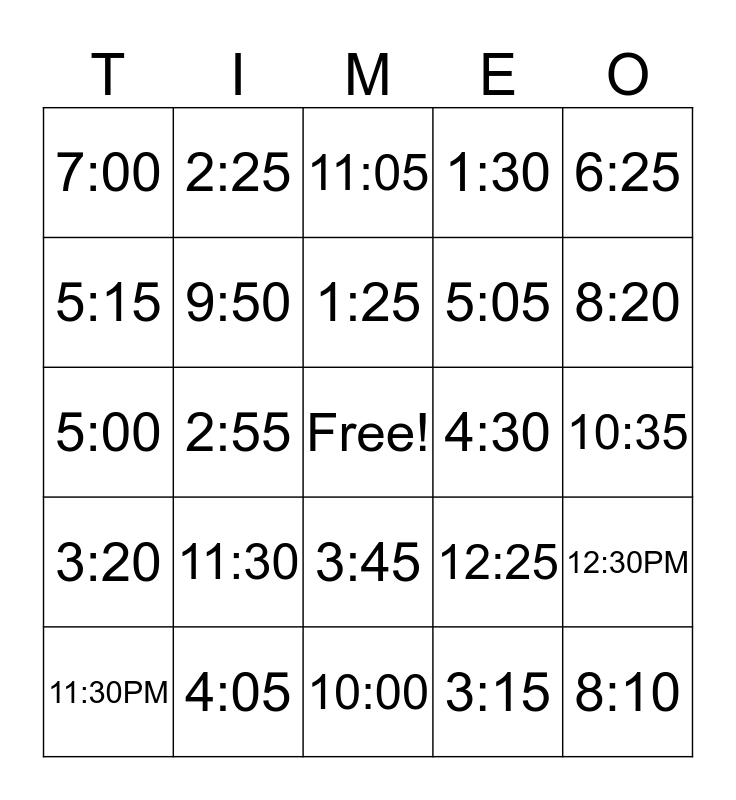 This bingo card has a free space and 28 words: 12:30PM, 2:20, 5:05, 3:15, 5:15, 11:05, 2:25, 3:20, 4:30, 11:30PM, 5:00, 1:30, 4:05, 10:00, 8:20, 6:00, 11:30, 9:50, 1:25, 3:45, 7:00, 8:40, 8:10, 2:55, 10:35, 12:25, 6:25 and 1:20.