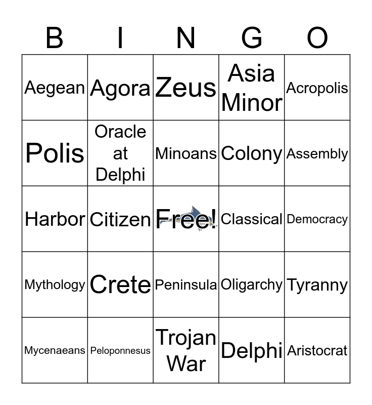 This bingo card has a free space and 24 words: Crete, Peloponnesus, Minoans, Mycenaeans, Acropolis, Aegean, Polis, Agora, Classical, Peninsula, Colony, Harbor, Oligarchy, Tyranny, Oracle at Delphi, Delphi, Democracy, Zeus, Assembly, Citizen, Aristocrat, Mythology, Asia Minor and Trojan War.
