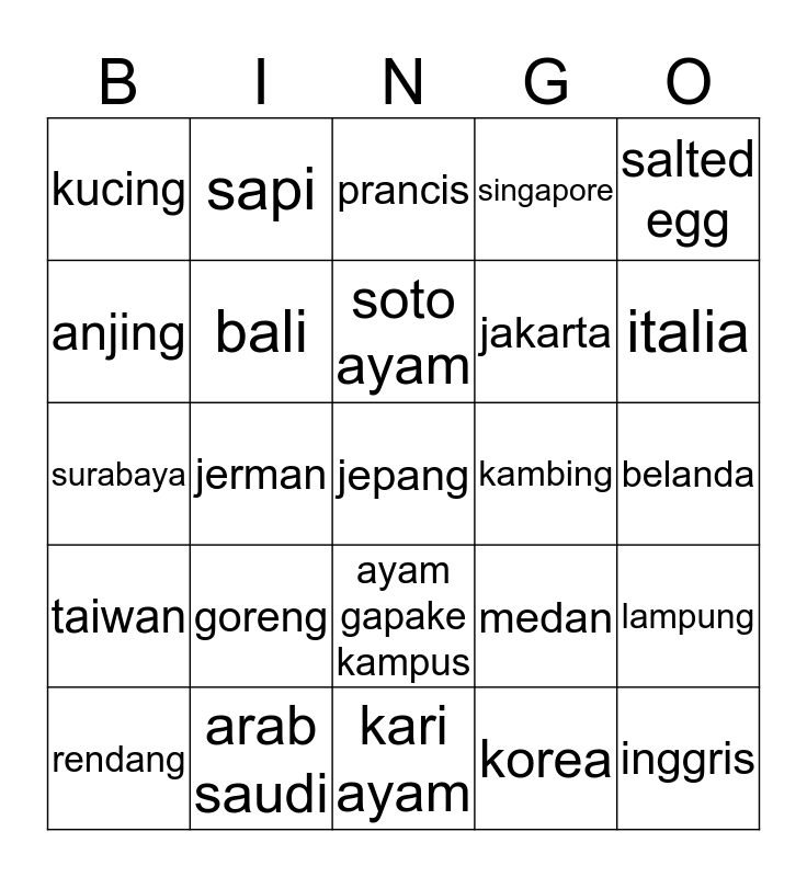 This bingo card has 25 words: goreng, kari ayam, soto ayam, rendang, salted egg, kucing, anjing, sapi, kambing, ayam gapake kampus, jakarta, surabaya, medan, lampung, bali, inggris, belanda, prancis, italia, jerman, jepang, arab saudi, taiwan, singapore and korea.