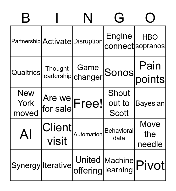 This bingo card has a free space and 59 words: Agile, Iterative, Sprint, AI, Machine learning, Future-proof, Thought leadership, Collaboration, Sonos, Data integration, Engine connect, EMX, Qualtrics, Shout-out to Matt, Hives, Partnership, Pivot, HBO sopranos, Engine Instagram, Game changer, Shout out to Scott, Disruption, Synergy, Move the needle, Big Data, Bleeding edge, Build the brand, KPI, Pain points, Value add, Top tier client, Key account, Talend, Headwind, Activate, Adjusted projection, Lake capital, Are we for sale, No bonus, New York moved, Connection drops, Client visit, Bayesian, Disparate, Go to market, Ad exchange, Media partners, Consolidate, Automation, United offering, Impression, 3-letter acronym you've never heard, Real time, Optimize, Transparency, Behavioral data, ROI, Geolocation and Media buy.