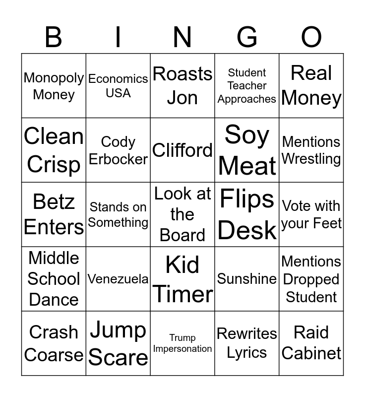 This bingo card has a free space and 24 words: Venezuela, Jump Scare, Clifford, Crash Coarse, Real Money, Monopoly Money, Clean Crisp, Economics USA, Flips Desk, Kid Timer, Soy Meat, Betz Enters, Sunshine, Mentions Dropped Student, Cody Erbocker, Rewrites Lyrics, Vote with your Feet, Roasts Jon, Mentions Wrestling, Stands on Something, Raid Cabinet, Middle School Dance, Student Teacher Approaches and Trump Impersonation.