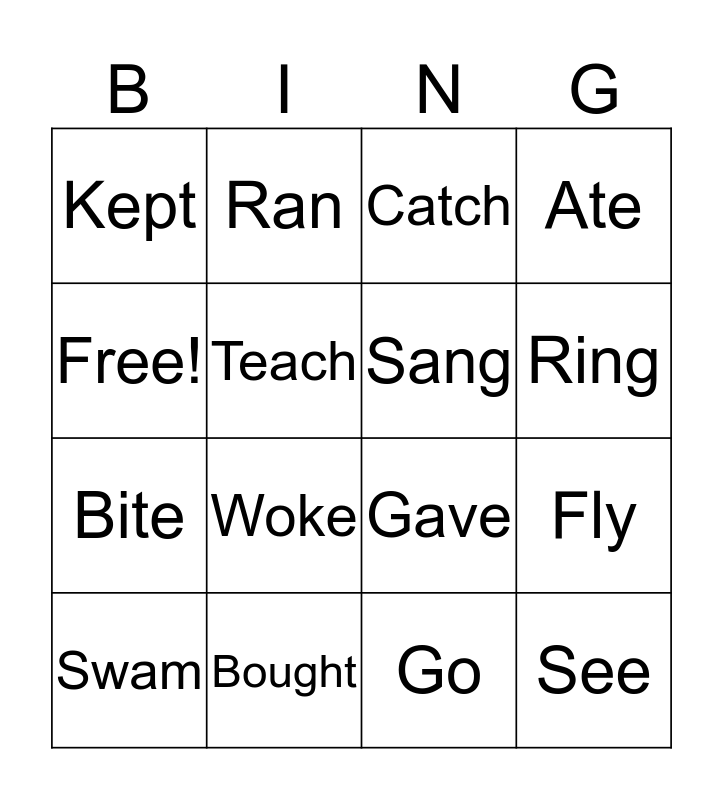 This bingo card has 16 words: Bought, Fly, Catch, Kept, Bite, Ran, Gave, Go, Free!, Teach, Swam, Ate, Woke, Ring, Sang and See.