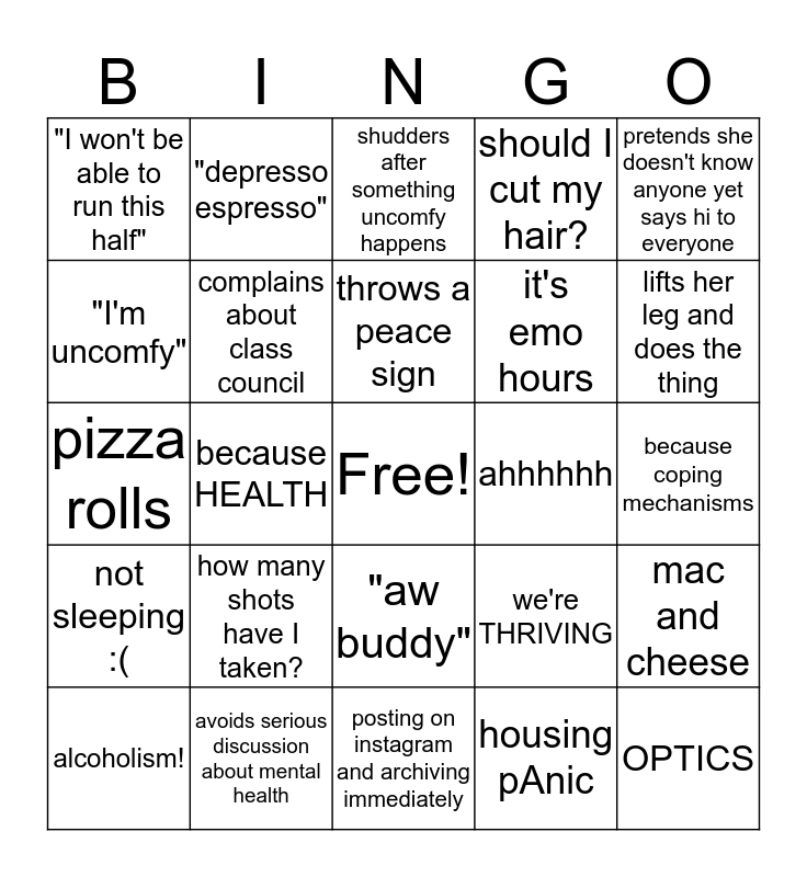 This bingo card has a free space and 24 words: how many shots have I taken?, avoids serious discussion about mental health, throws a peace sign, alcoholism!, pretends she doesn't know anyone yet says hi to everyone, "I won't be able to run this half", "I'm uncomfy", "depresso espresso", ahhhhhh, "aw buddy", it's emo hours, pizza rolls, we're THRIVING, mac and cheese, complains about class council, housing pAnic, because coping mechanisms, shudders after something uncomfy happens, lifts her leg and does the thing, because HEALTH, OPTICS, not sleeping :(, should I cut my hair? and posting on instagram and archiving immediately.