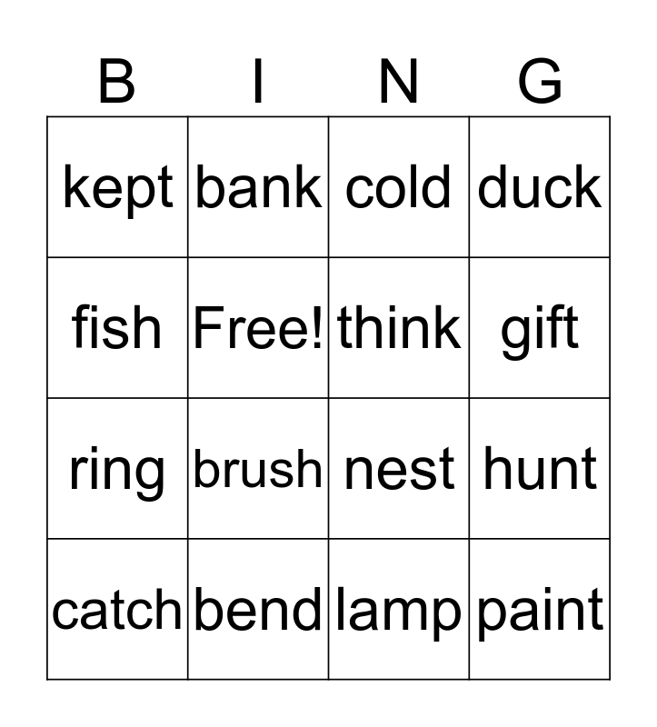 This bingo card has 16 words: bend, hunt, cold, kept, ring, bank, nest, lamp, fish, Free!, catch, duck, brush, gift, think and paint.