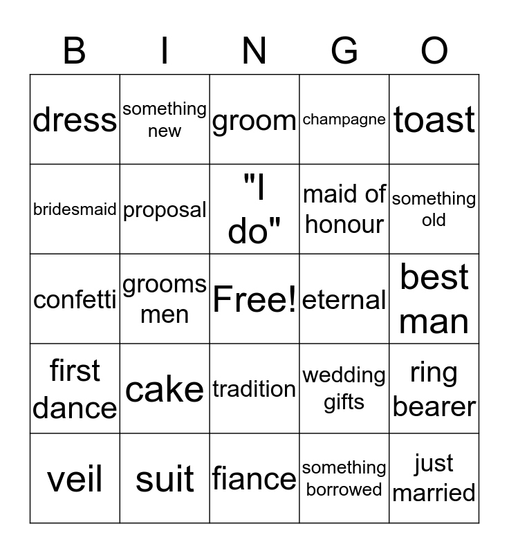 This bingo card has a free space and 33 words: ceremony, flowers, grooms men, invitations, first dance, proposal, toast, veil, something new, romantic, "I do", groom, bride, memories, eternal, something old, suit, confetti, cake, wedding gifts, tradition, honeymoon, dress, best man, fiance, just married, champagne, maid of honour, bridesmaid, ring bearer, reception, something borrowed and something blue.