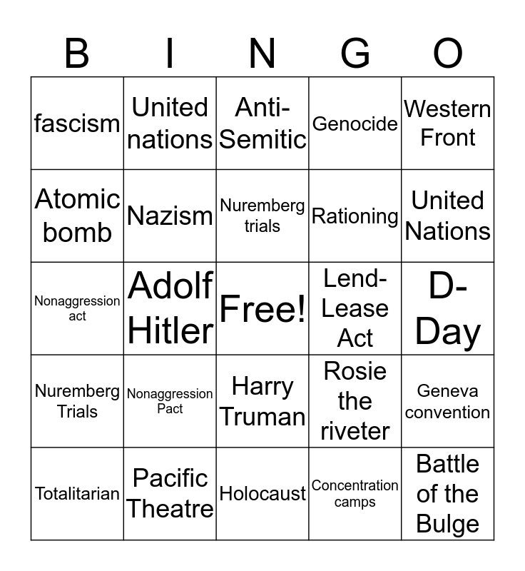 This bingo card has a free space and 29 words: Totalitarian, Dictator, Adolf Hitler, Benito Mussolini, fascism, Anti-Semitic, Nazism, Nonaggression Pact, Lend-Lease Act, Pacific Theatre, D-Day, Battle of the Bulge, Holocaust, Concentration camps, United Nations, “final solution”, Harry Truman, Nuremberg Trials, Western Front, Nonaggression act, Rosie the riveter, Internment, Rationing, Atomic bomb, Genocide, United nations, Geneva convention, Nuremberg trials and V-E day.