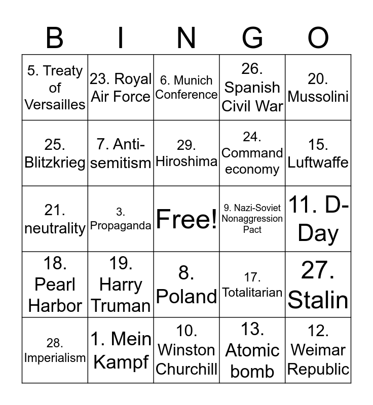 This bingo card has a free space and 30 words: 1. Mein Kampf, 2. Indoctrination, 3. Propaganda, 4. Appeasement, 5. Treaty of Versailles, 6. Munich Conference, 7. Anti-semitism, 8. Poland, 9. Nazi-Soviet Nonaggression Pact, 10. Winston Churchill, 11. D-Day, 12. Weimar Republic, 13. Atomic bomb, 14. Classless society, 15. Luftwaffe, 16. Collectivization, 17. Totalitarian, 18. Pearl Harbor, 19. Harry Truman, 20. Mussolini, 21. neutrality, 22. Five Year Plans, 23. Royal Air Force, 24. Command economy, 25. Blitzkrieg, 26. Spanish Civil War, 27. Stalin, 28. Imperialism, 29. Hiroshima and 30. Nagasaki.