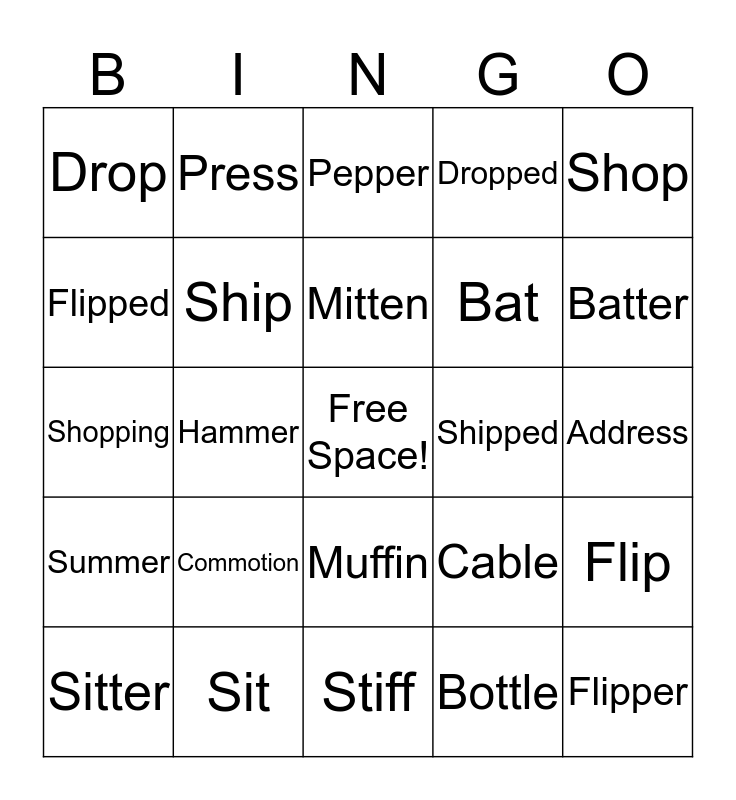 This bingo card has a free space and 24 words: Commotion, Sit, Mitten, Sitter, Shop, Drop, Flipped, Press, Shipped, Muffin, Bat, Shopping, Cable, Flip, Ship, Bottle, Address, Pepper, Batter, Hammer, Flipper, Summer, Dropped and Stiff.