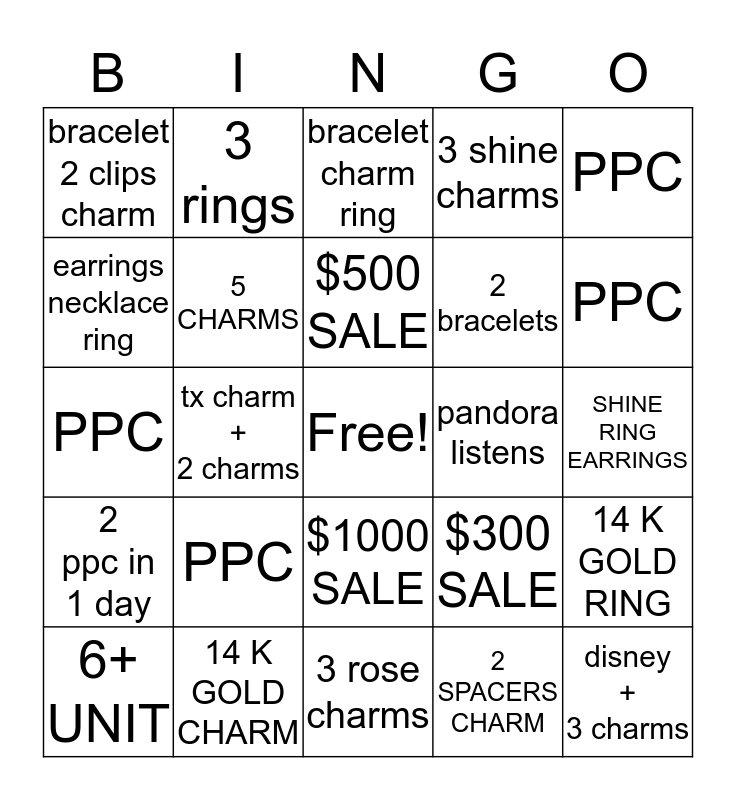 This bingo card has a free space and 24 words: PPC, 14 K GOLD CHARM, $500 SALE, 6+ UNIT, PPC, bracelet 2 clips charm, earrings necklace ring, 3 rings, pandora listens, $1000 SALE, 2 bracelets, PPC, $300 SALE, 14 K GOLD RING, 5 CHARMS, 2 SPACERS CHARM, SHINE RING EARRINGS, bracelet charm ring, PPC, tx charm + 2 charms, disney + 3 charms, 2 ppc in 1 day, 3 shine charms and 3 rose charms.