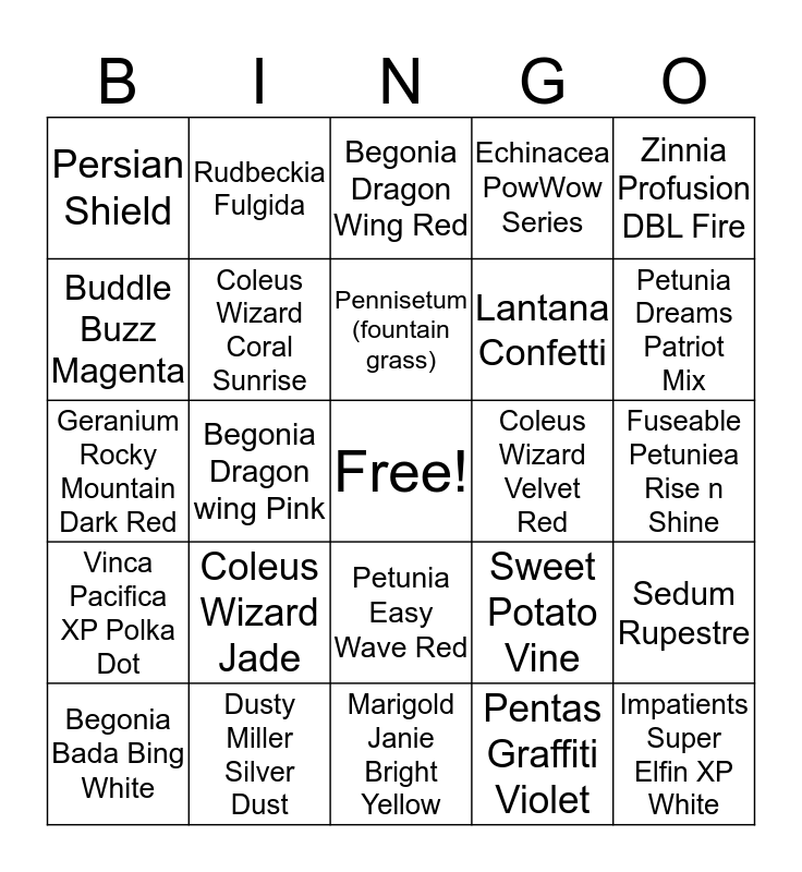 This bingo card has a free space and 29 words: Begonia Bada Bing White, Begonia Bada Bing Pink, Begonia Dragon wing Pink, Mexican Fountain Grass, Persian Shield, Begonia Dragon Wing Red, Coleus Wizard Coral Sunrise, Coleus Wizard Jade, Coleus Wizard Velvet Red, Dusty Miller Silver Dust, Fuseable Petuniea Rise n Shine, Impatients Super Elfin XP White, Marigold Janie Bright Yellow, Pentas Graffiti Violet, Petunia Dreams Patriot Mix, Petunia Easy Wave Blue, Petunia Easy Wave Red, Vinca Pacifica XP Polka Dot, Zinnia Profusion DBL Fire, Geranium Rocky Mountain Dark Red, Sweet Potato Vine, Tricolor Sweet Potato Vine, Lantana Confetti, Buddle Buzz Magenta, Echinacea PowWow Series, Rudbeckia Fulgida, Sedum Rupestre, Pennisetum (fountain grass) and Boston Ferns.