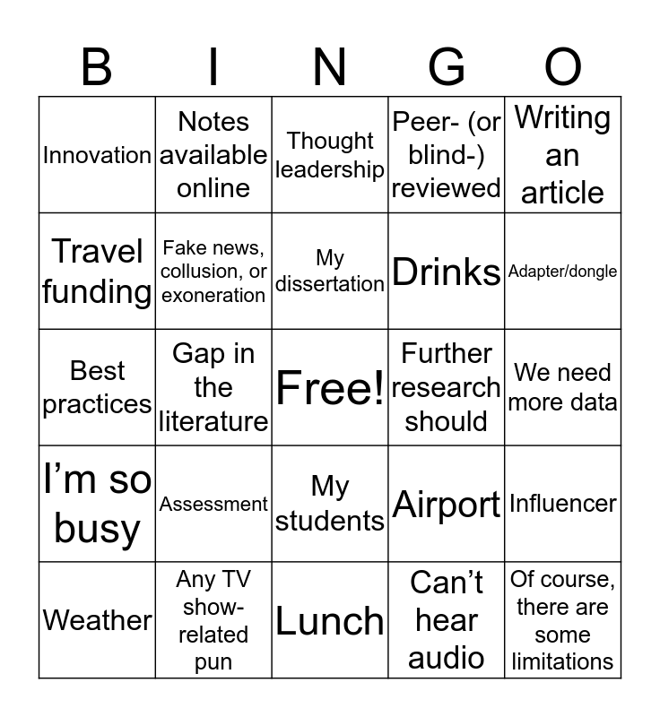 This bingo card has a free space and 41 words: Professional development, Best practices, Complicate, Fake news, collusion, or exoneration, Any TV show-related pun, My students, My dissertation, My book, Writing an article, I’m so busy, Gap in the literature, Peer- (or blind-) reviewed, Of course, there are some limitations, We need more data, Further research should, Assessment, Administration, Innovation, High-impact practices, Thought leadership, Influencer, Coffee, Lunch, Drinks, PowerPoint, Hashtag, Can’t hear audio, Can’t see video, Adapter/dongle, Where’s the [Blank] panel?, Plug [Blank] panel, Notes available online, Weather, Keynote address, Airport, Travel funding, Uber/Lyft, Teaching tip, I’m so tired, Crooked finger hand gesture and Air quotes.