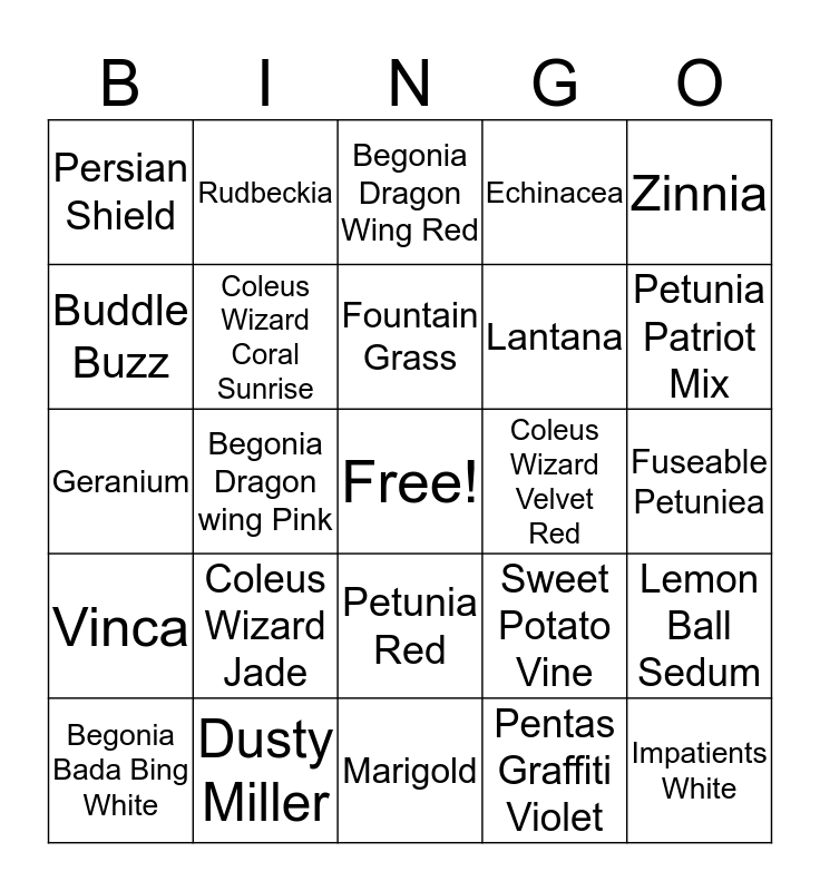 This bingo card has a free space and 29 words: Begonia Bada Bing White, Begonia Bada Bing Pink, Begonia Dragon wing Pink, Mexican Fountain Grass, Persian Shield, Begonia Dragon Wing Red, Coleus Wizard Coral Sunrise, Coleus Wizard Jade, Coleus Wizard Velvet Red, Dusty Miller, Fuseable Petuniea, Impatients White, Marigold, Pentas Graffiti Violet, Petunia Patriot Mix, Petunia Blue, Petunia Red, Vinca, Zinnia, Geranium, Sweet Potato Vine, Tricolor Sweet Potato Vine, Lantana, Buddle Buzz, Echinacea, Rudbeckia, Lemon Ball Sedum, Fountain Grass and Boston Ferns.