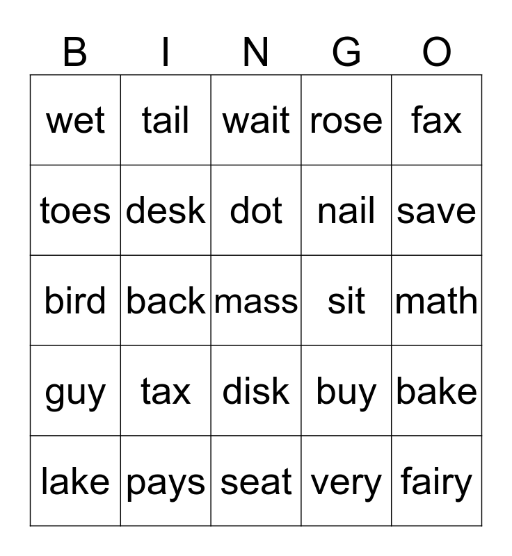 This bingo card has 30 words: pays, page, back, bag, wet, wait, desk, disk, sit, seat, math, mass, very, fairy, save, safe, buy, guy, tax, fax, bird, third, tail, nail, toes, rose, bake, lake, dot and yacht.