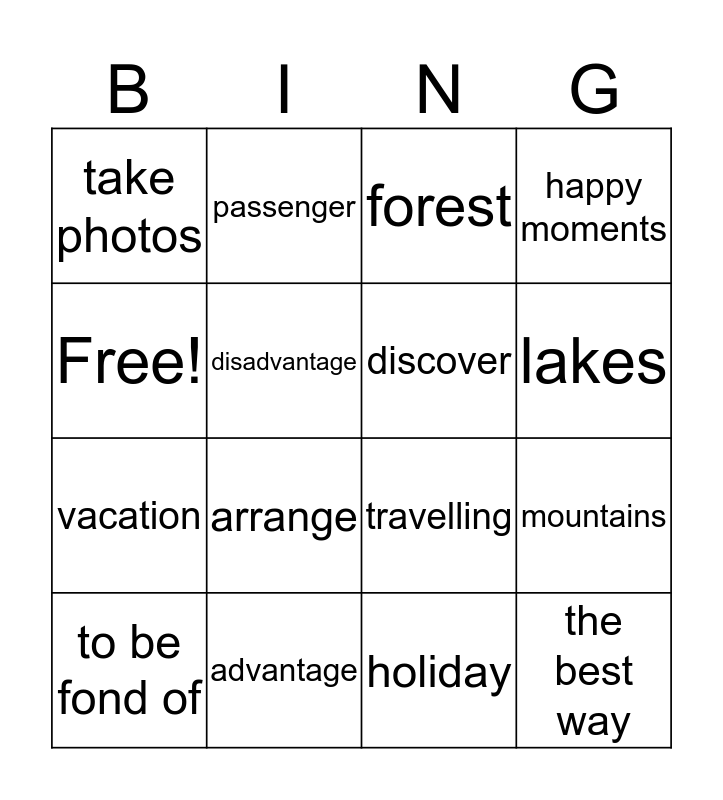This bingo card has 16 words: advantage, mountains, forest, take photos, vacation, passenger, travelling, holiday, Free!, disadvantage, to be fond of, happy moments, arrange, lakes, discover and the best way.