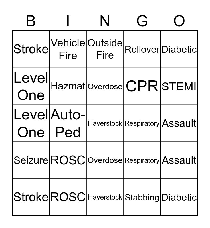 This bingo card has 50 words: Seizure, ROSC, Structure Fire, Rollover, Assault, Shooting, Vehicle Fire, Gas Leak, CPR, Fire Alarm, Stroke, Hazmat, Haverstock, Stabbing, STEMI, Back Pain, Auto-Ped, Overdose, Fuel Spill, Diabetic, Level One, OB Call, Outside Fire, Respiratory, Entrapment, Seizure, ROSC, Structure Fire, Rollover, Assault, Shooting, Vehicle Fire, Gas Leak, CPR, Fire Alarm, Stroke, Hazmat, Haverstock, Stabbing, STEMI, Back Pain, Auto-Ped, Overdose, Fuel Spill, Diabetic, Level One, OB Call, Outside Fire, Respiratory and Entrapment.