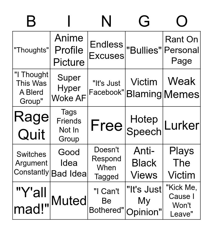 This bingo card has a free space and 24 words: Good Idea Bad Idea, Muted, "It's Just Facebook", "Y'all mad!", Rant On Personal Page, "Thoughts", "I Thought This Was A Blerd Group", Anime Profile Picture, Hotep Speech, Doesn't Respond When Tagged, Victim Blaming, Rage Quit, Anti-Black Views, Plays The Victim, Super Hyper Woke AF, "It's Just My Opinion", Lurker, Endless Excuses, Weak Memes, Tags Friends Not In Group, "Kick Me, Cause I Won't Leave", Switches Argument Constantly, "Bullies" and "I Can't Be Bothered".