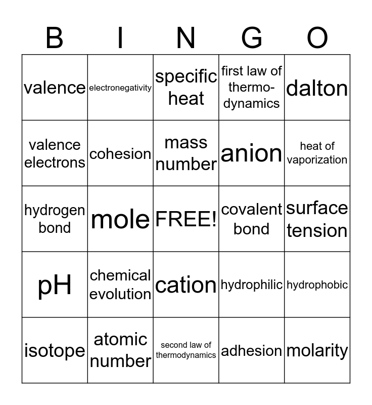 This bingo card has a free space and 24 words: chemical evolution, atomic number, mass number, isotope, dalton, valence, valence electrons, electronegativity, covalent bond, cation, anion, hydrogen bond, hydrophilic, hydrophobic, cohesion, adhesion, surface tension, specific heat, heat of vaporization, mole, molarity, pH, first law of thermo-dynamics and second law of thermodynamics.