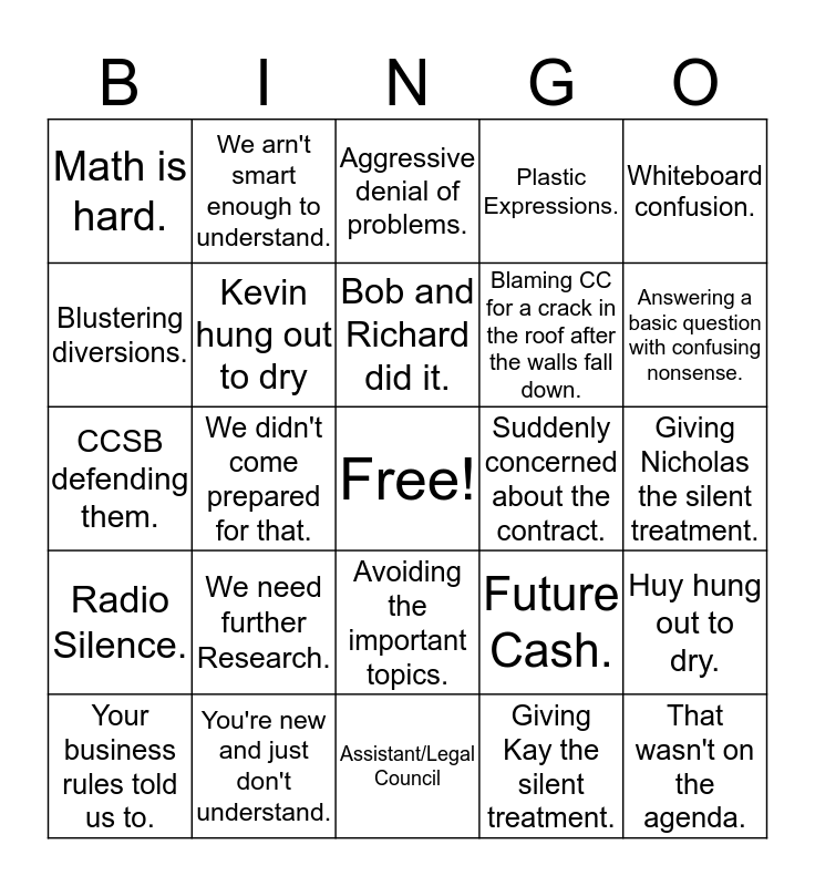 This bingo card has a free space and 24 words: We need further Research., You're new and just don't understand., Bob and Richard did it., Your business rules told us to., Whiteboard confusion., Math is hard., Blustering diversions., We arn't smart enough to understand., Suddenly concerned about the contract., Avoiding the important topics., Blaming CC for a crack in the roof after the walls fall down., CCSB defending them., Future Cash., Huy hung out to dry., Kevin hung out to dry, Giving Kay the silent treatment., Giving Nicholas the silent treatment., Aggressive denial of problems., Answering a basic question with confusing nonsense., We didn't come prepared for that., That wasn't on the agenda., Radio Silence., Plastic Expressions. and Assistant/Legal Council.
