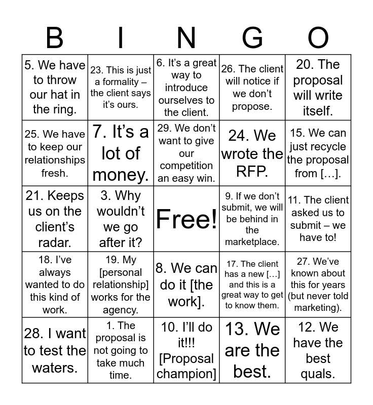 This bingo card has a free space and 30 words: 1. The proposal is not going to take much time., 2. It’s an easy proposal., 3. Why wouldn’t we go after it?, 4. We’ve been tracking this for […]., 5. We have to throw our hat in the ring., 6. It’s a great way to introduce ourselves to the client., 7. It’s a lot of money., 8. We can do it [the work]., 9. If we don’t submit, we will be behind in the marketplace., 10. I’ll do it!!! [Proposal champion], 11. The client asked us to submit – we have to!, 12. We have the best quals., 13. We are the best., 14. […] needs the work., 15. We can just recycle the proposal from […]., 16. This is right up our alley., 17. The client has a new […] and this is a great way to get to know them., 18. I’ve always wanted to do this kind of work., 19. My [personal relationship] works for the agency., 20. The proposal will write itself., 21. Keeps us on the client’s radar., 22. We have to do this if we want to ever work for client., 23. This is just a formality – the client says it’s ours., 24. We wrote the RFP., 25. We have to keep our relationships fresh., 26. The client will notice if we don’t propose., 27. We’ve known about this for years (but never told marketing)., 28. I want to test the waters., 29. We don’t want to give our competition an easy win. and 30. Because I want to..