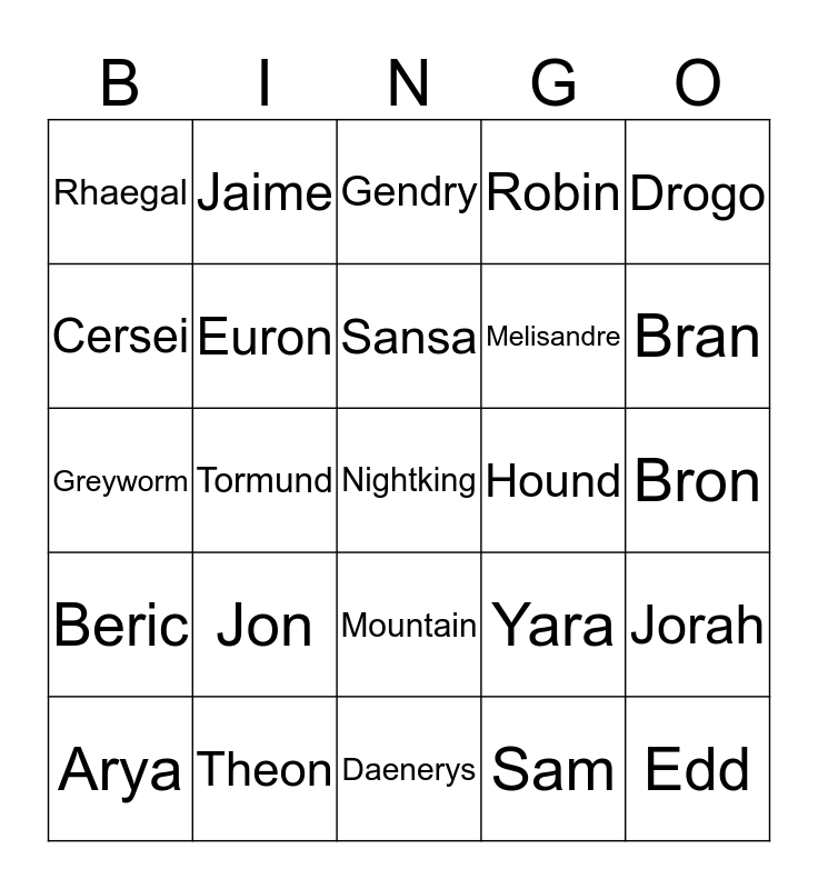 This bingo card has 25 words: Jon, Daenerys, Sansa, Arya, Drogo, Rhaegal, Cersei, Jaime, Hound, Mountain, Melisandre, Greyworm, Yara, Jorah, Euron, Edd, Bron, Gendry, Bran, Tormund, Nightking, Theon, Beric, Robin and Sam.
