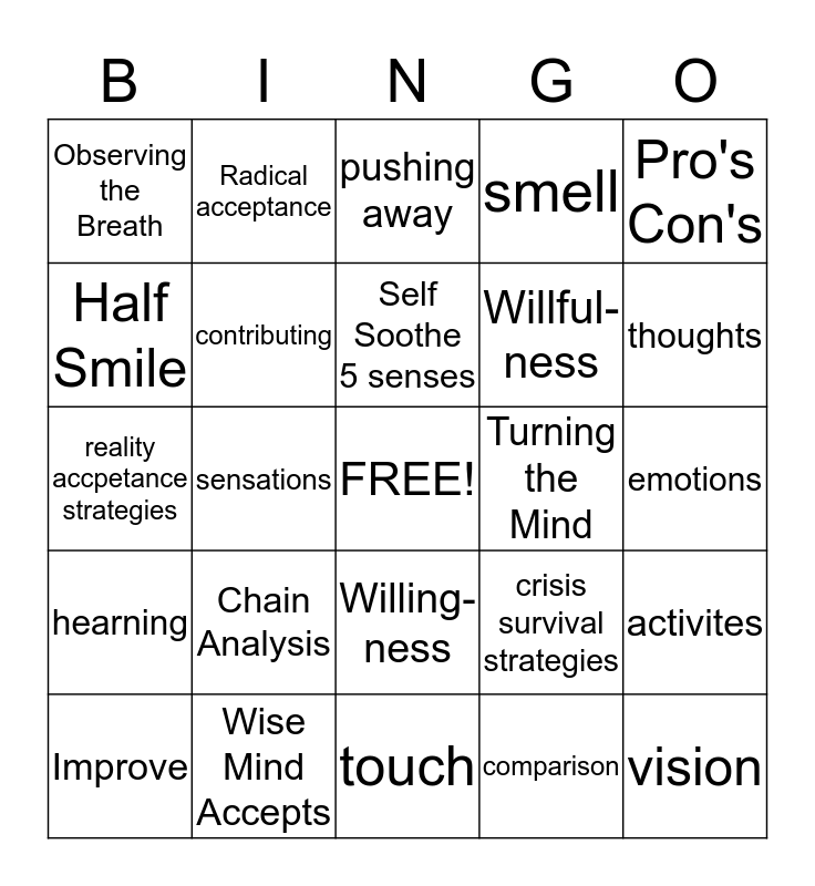 This bingo card has a free space and 24 words: Chain Analysis, Wise Mind Accepts, Self Soothe 5 senses, Improve, Pro's Con's, Observing the Breath, Half Smile, Radical acceptance, Turning the Mind, Willing- ness, Willful- ness, reality accpetance strategies, crisis survival strategies, activites, contributing, comparison, emotions, pushing away, thoughts, sensations, vision, hearning, smell and touch.