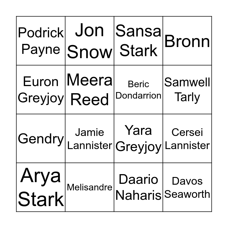 This bingo card has 16 words: Melisandre, Cersei Lannister, Sansa Stark, Podrick Payne, Gendry, Jon Snow, Yara Greyjoy, Daario Naharis, Euron Greyjoy, Meera Reed, Arya Stark, Bronn, Jamie Lannister, Samwell Tarly, Beric Dondarrion and Davos Seaworth.