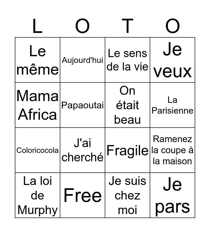 This bingo card has 17 words: Je suis chez moi, La loi de Murphy, Le sens de la vie, Le même, J'ai cherché, Je veux, Ramenez la coupe à la maison, On était beau, La Parisienne, Papaoutai, Free, Fragile, Mama Africa, Aujourd'hui, Coloricocola, Je te le donne and Je pars.