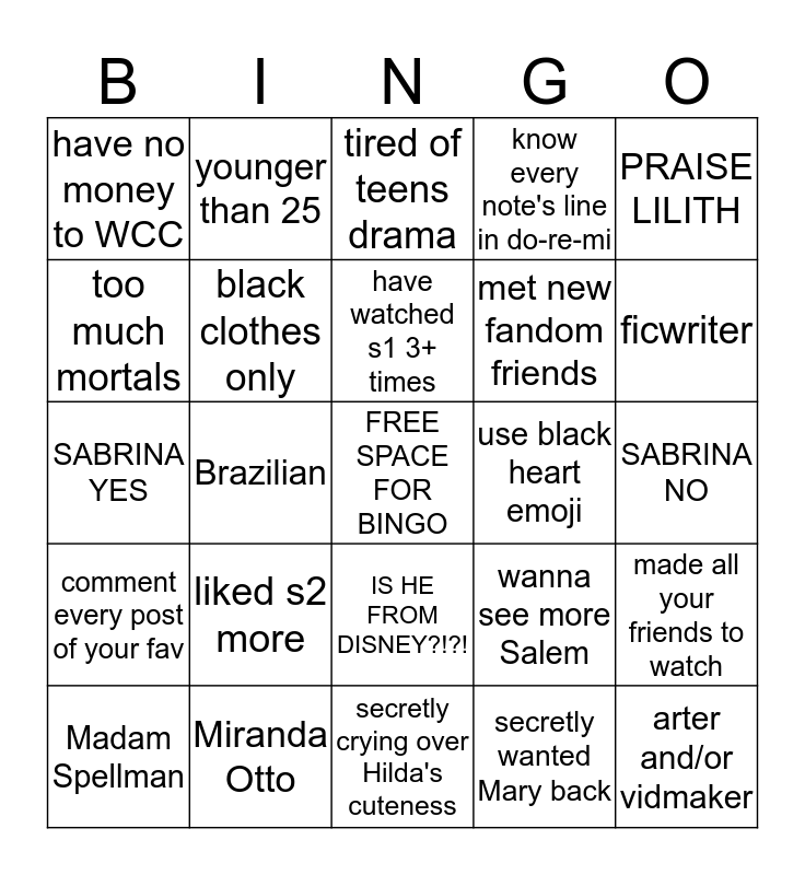 This bingo card has a free space and 24 words: Madam Spellman, liked s2 more, have watched s1 3+ times, secretly wanted Mary back, PRAISE LILITH, have no money to WCC, younger than 25, tired of teens drama, use black heart emoji, SABRINA NO, SABRINA YES, black clothes only, wanna see more Salem, made all your friends to watch, too much mortals, Miranda Otto, secretly crying over Hilda's cuteness, know every note's line in do-re-mi, ficwriter, comment every post of your fav, Brazilian, IS HE FROM DISNEY?!?!, met new fandom friends and arter and/or vidmaker.