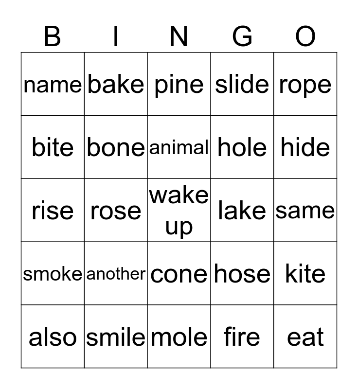 This bingo card has a free space and 24 words: another, smile, animal, also, rope, name, bite, bake, lake, cone, hole, rise, hose, kite, bone, fire, same, pine, hide, rose, eat, smoke, slide and mole.