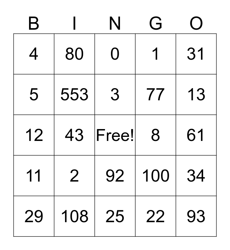 This bingo card has a free space and 24 words: 2, 108, 3, 29, 31, 4, 5, 80, 8, 92, 77, 12, 100, 34, 553, 22, 61, 0, 13, 43, 93, 11, 1 and 25.